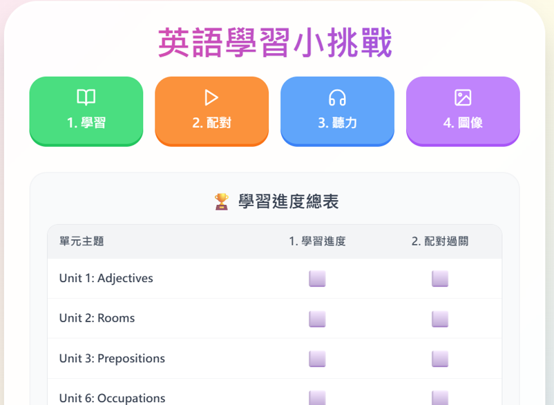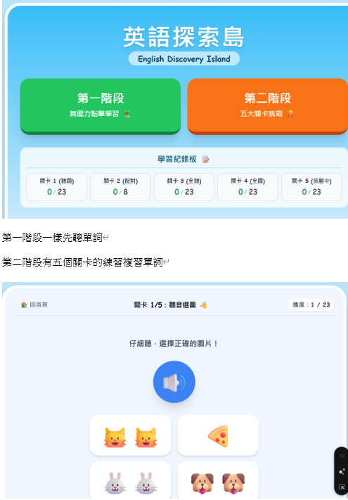 無壓力的闖關設計: 遊戲通常分為多個階段,例如從「聽聲音找圖片」的無壓力點擊,到進階的「看字找圖」、「聽問句找答句」等 。透過重複的破關機制,孩子們在不知不覺中反覆練習了那些總是記不住的目標單字與句子。